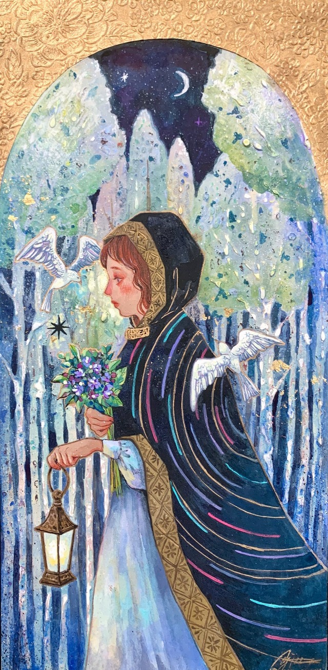 原画『君を待つ千夜 Ⅱ』 サイズ:F3号変形 使用画材:麻紙に岩絵具、アクリル絵具、箔など 額・箱付き