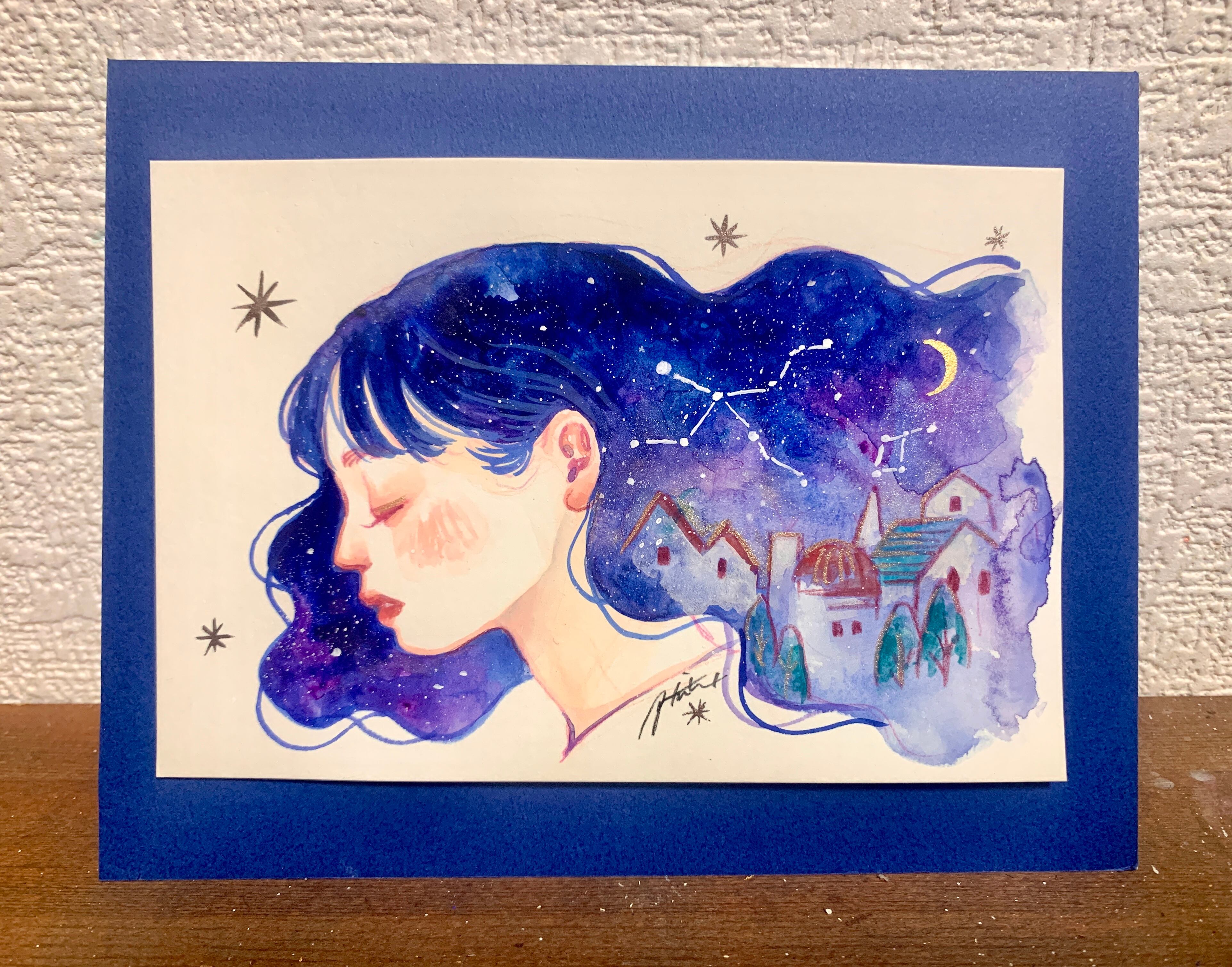 使用画材:水彩紙に色鉛筆、アクリル絵具、顔彩