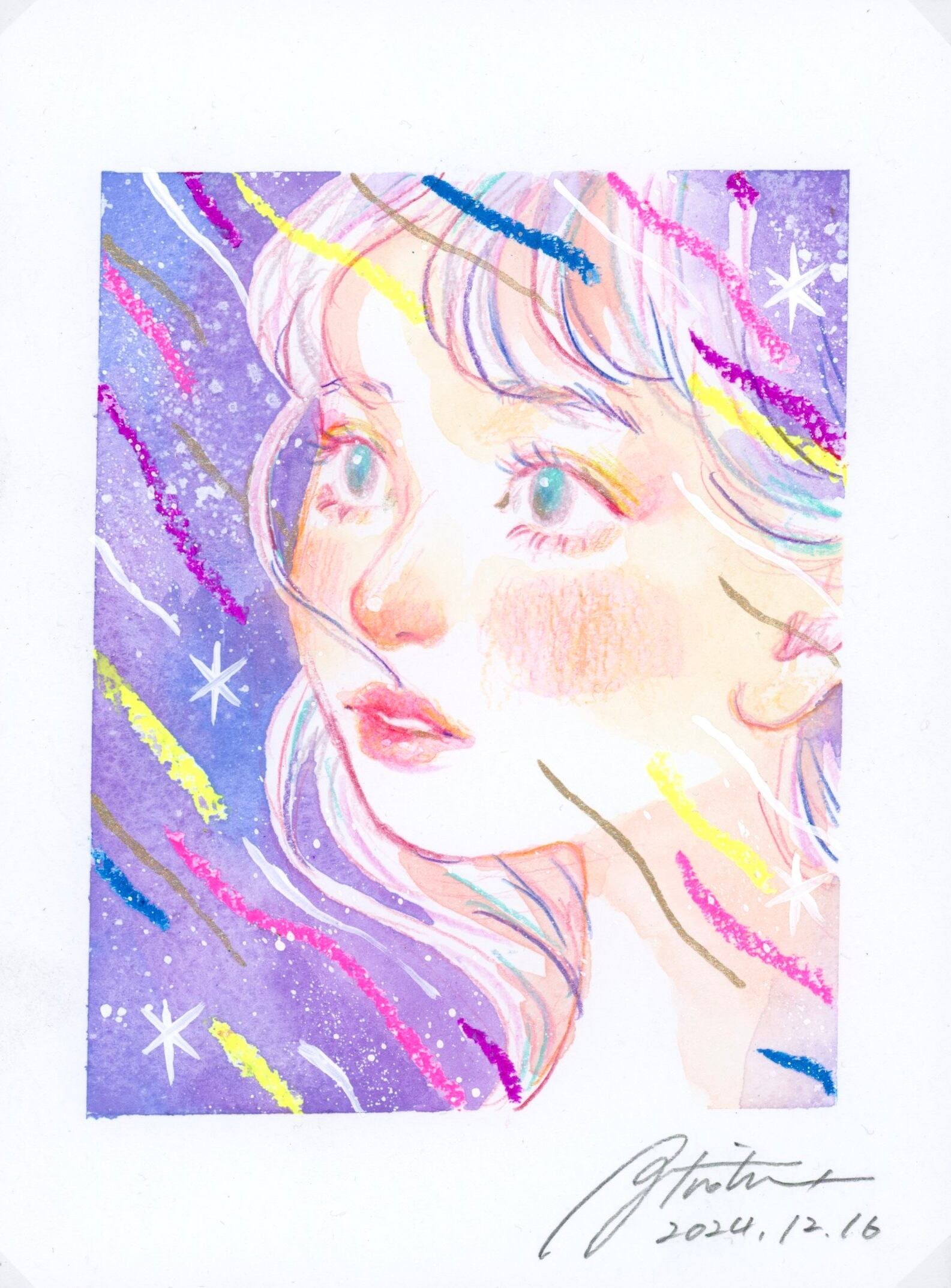 使用画材:水彩紙に色鉛筆、クレヨン、透明水彩